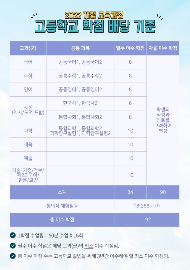 ❗️ 최소 192학점(교과 174+창체18)을 채워야 고등학교 졸업이 가능하며, 일부 미이수 과목이 발생 시 192학점을 채우지 못하는 경우가 생길 수 있음. 하지만 학교에서 해당 과목에 대한 보충지도 등을 통해 학생의 학점 취득을 지원함(보충지도를 통해 E를 받아도 이수 처리가 가능함).